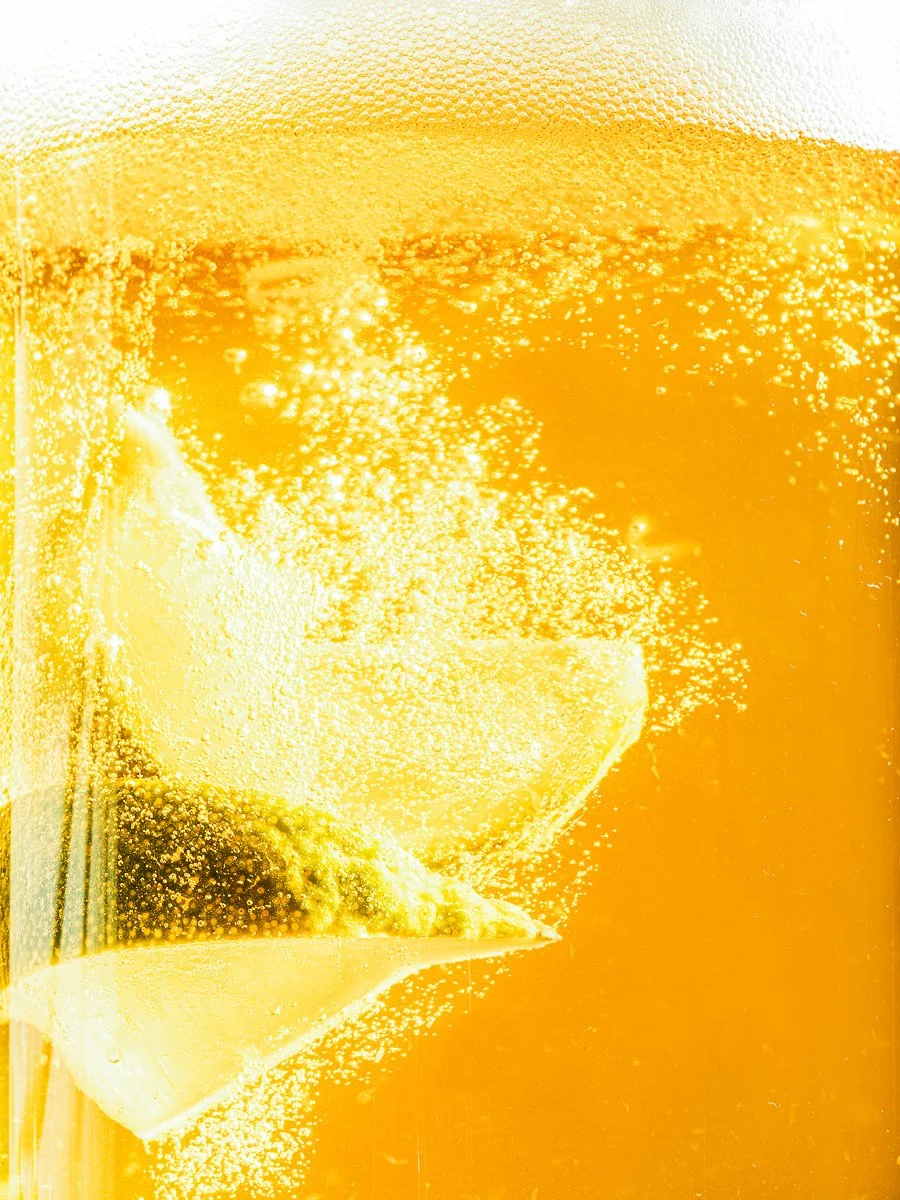 Close-up of a glass of beer with a lime wedge on the rim, as golden beer is poured into the glass, creating a foamy head and bubbles.