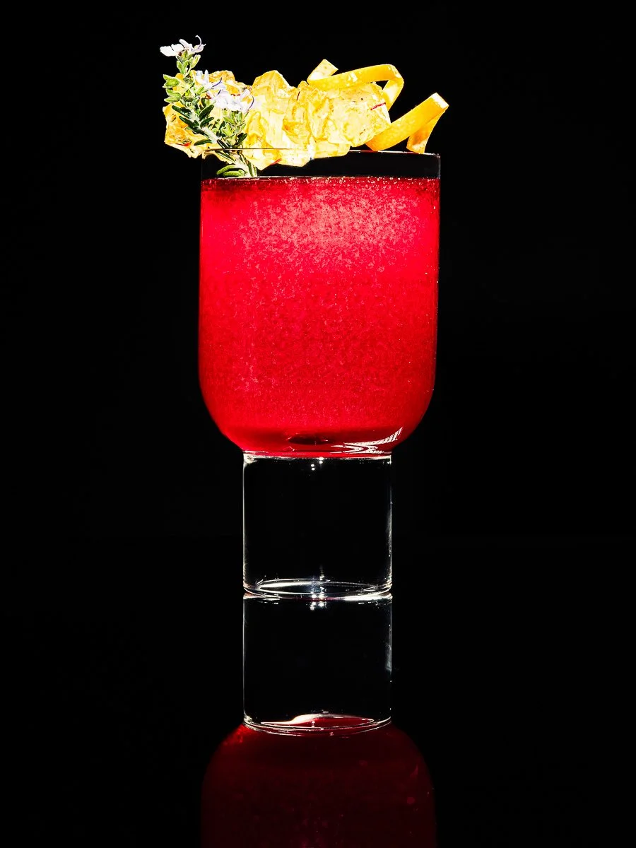 A red cocktail garnished with a sprig of lavender and lemon peel, served in a tall glass on a black background.