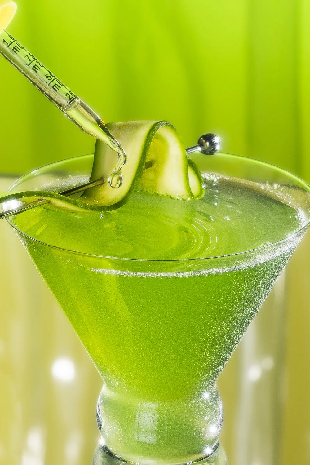 Green cocktail in a glass garnished with a cucumber slice and a metal cocktail pick, with a dropper above it containing a yellow liquid, against a green background.