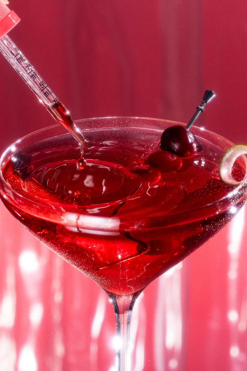 A red cocktail in a martini glass with a cherry and a slice of lime, garnished with a toothpick, with a dropper filled with red liquid hanging over the drink against a pink background.