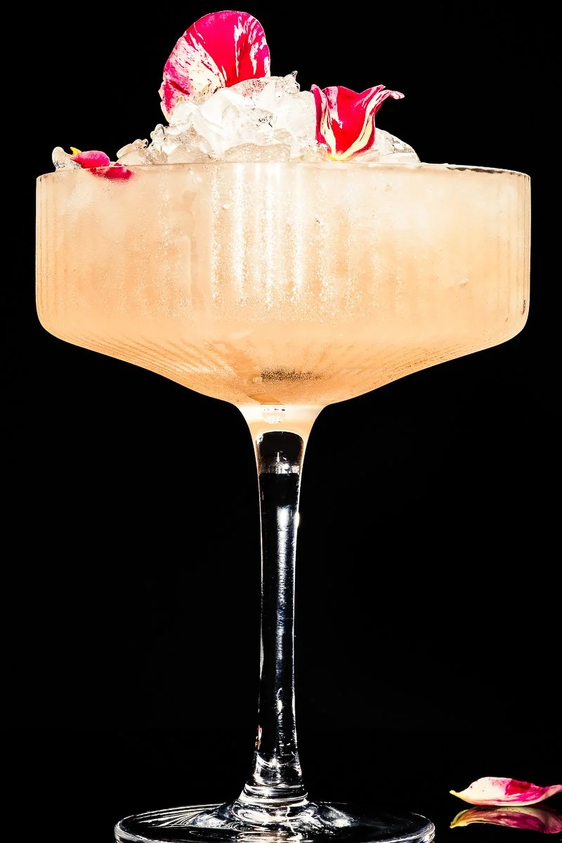 A light pink cocktail in a coupe glass, garnished with ice and pink and red flower petals, against a black background.