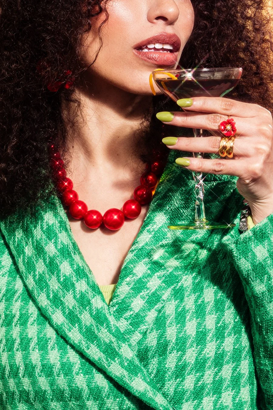 A woman with curly hair wearing a green houndstooth patterned blazer, red beaded necklace, red earrings, and gold rings. She is holding a cocktail glass with a lemon twist garnish in front of her lips.