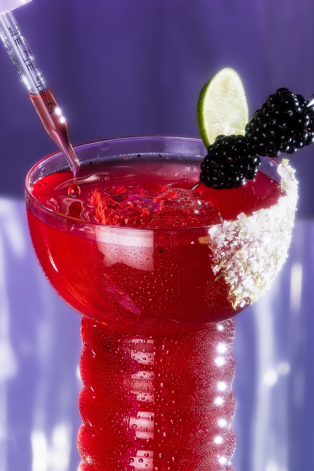 A red cocktail garnished with a lime wedge, blackberries, and a salted rim, with a straw and a dropper above the drink.
