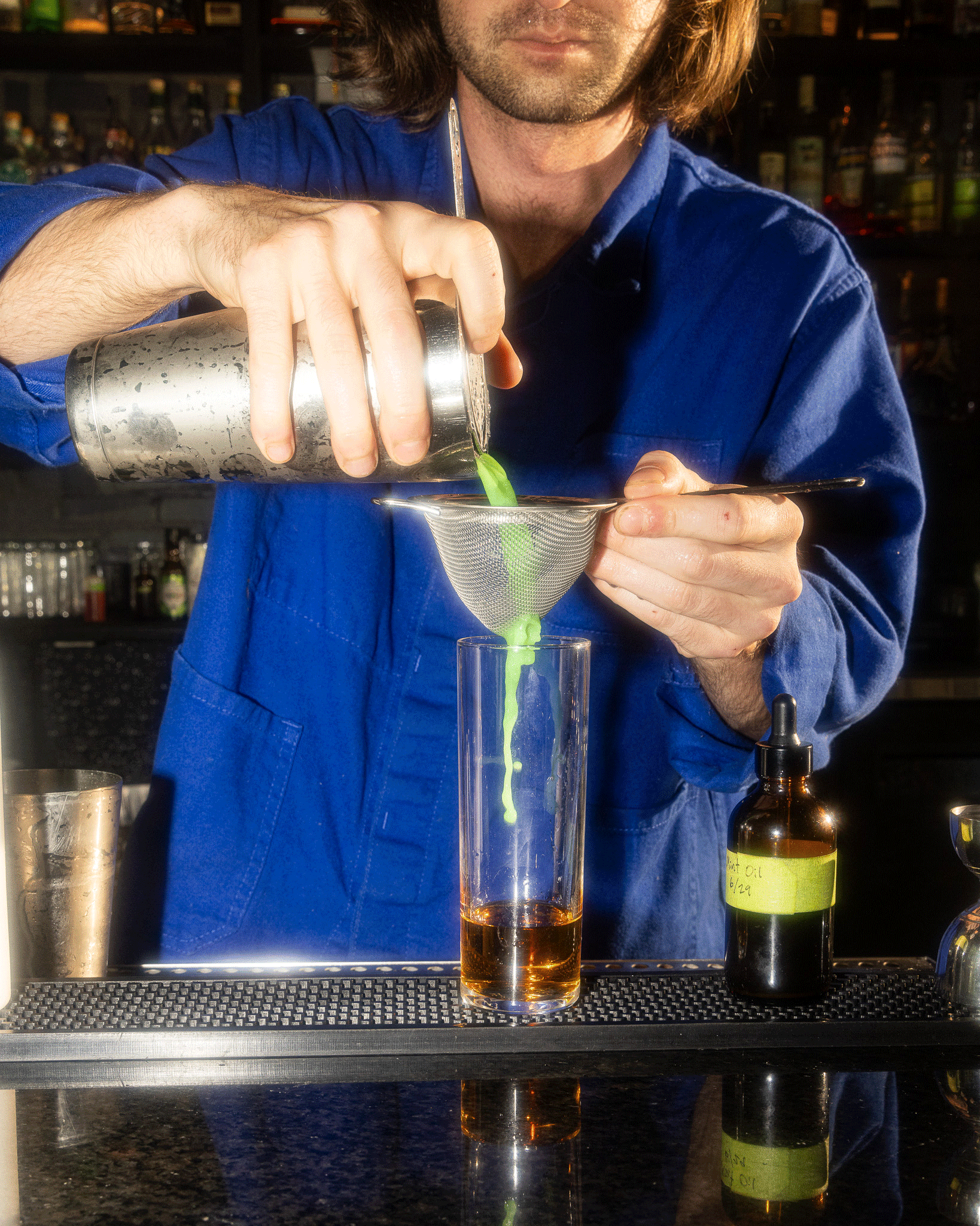 A bartender in a blue shirt pouring a bright green liquid through a fine mesh strainer into a tall glass with a dark liquid, with bar tools and bottles in the background.
