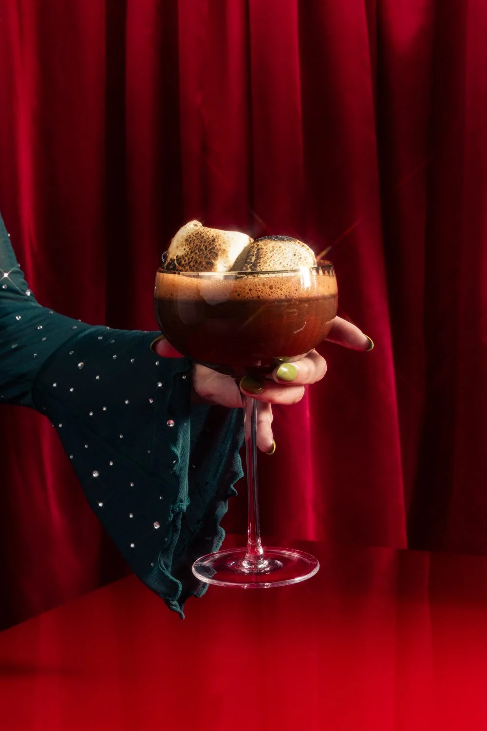Person holding a glass of hot chocolate topped with toasted marshmallows, with red curtains in the background.