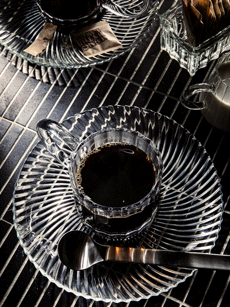 A glass cup of black coffee on a decorative glass plate with a spoon, set on a black tile surface with additional glassware and containers nearby.