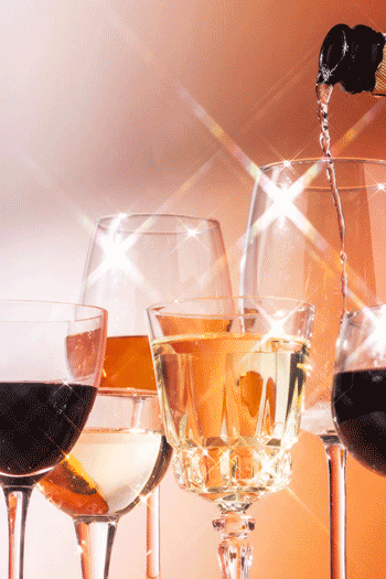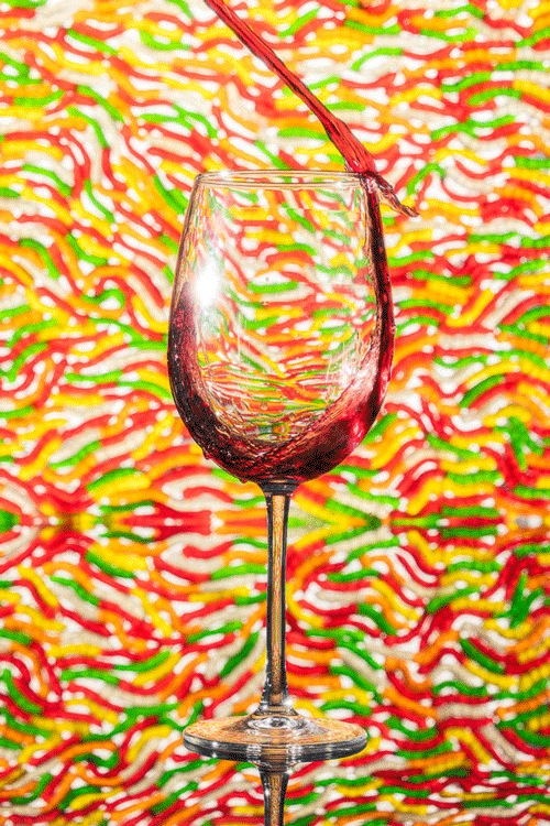A clear wine glass with red wine being poured into it, set against a vibrant, swirling multicolored background of red, green, yellow, and white.