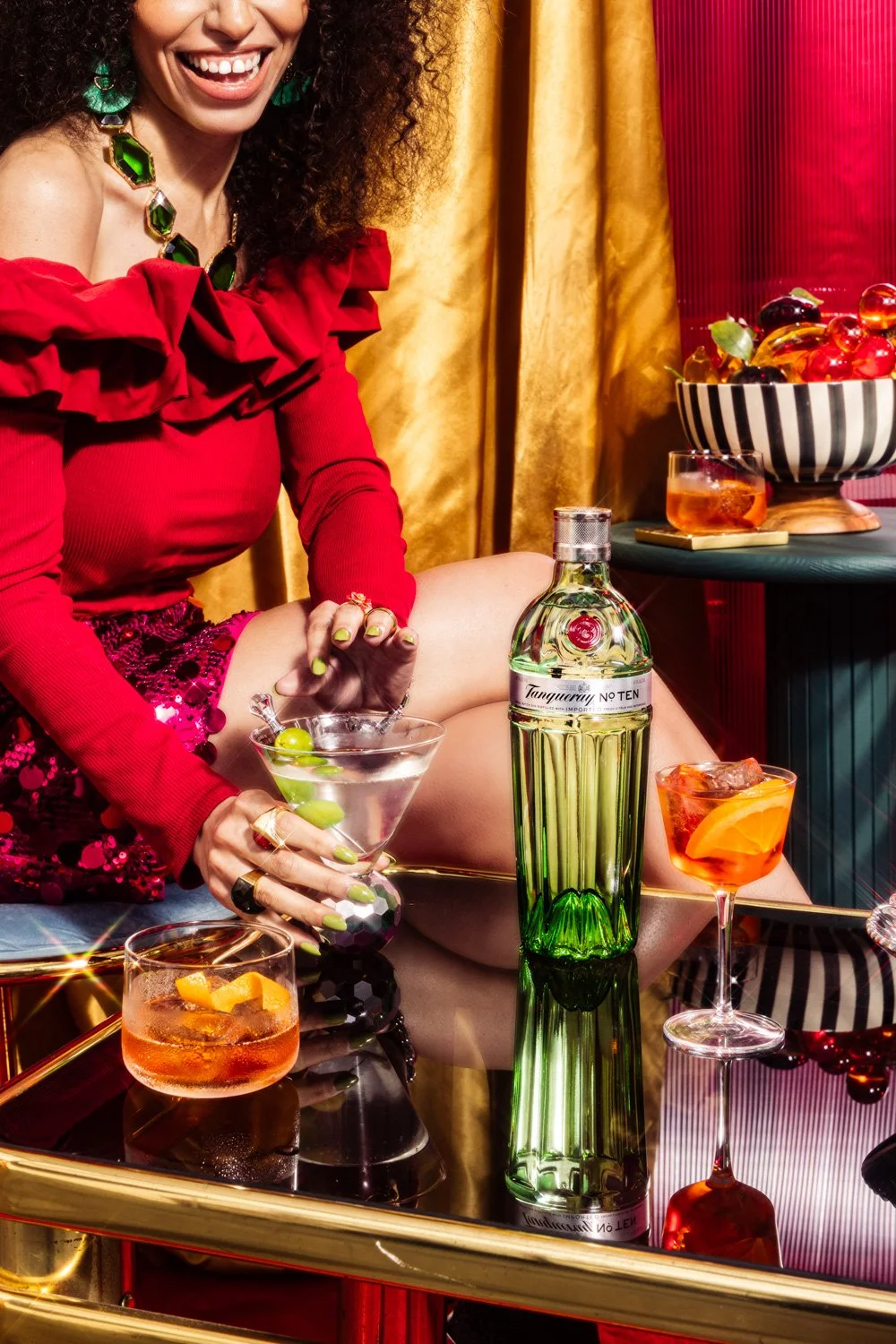 A woman with curly hair wearing a red top with ruffled sleeves, large green jewelry, and bright green nails sitting at a bar with various colorful cocktails, a large bottle of Tanqueray gin, and a bowl of fruit garnishments against a backdrop of gold