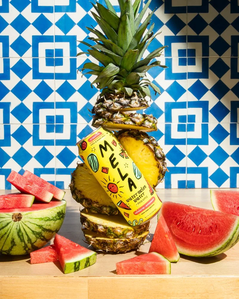 A pineapple with slices cut out and a melon with pieces cut out, surrounded by additional slices of watermelon on a wooden surface, set against a blue and white patterned tiled wall.