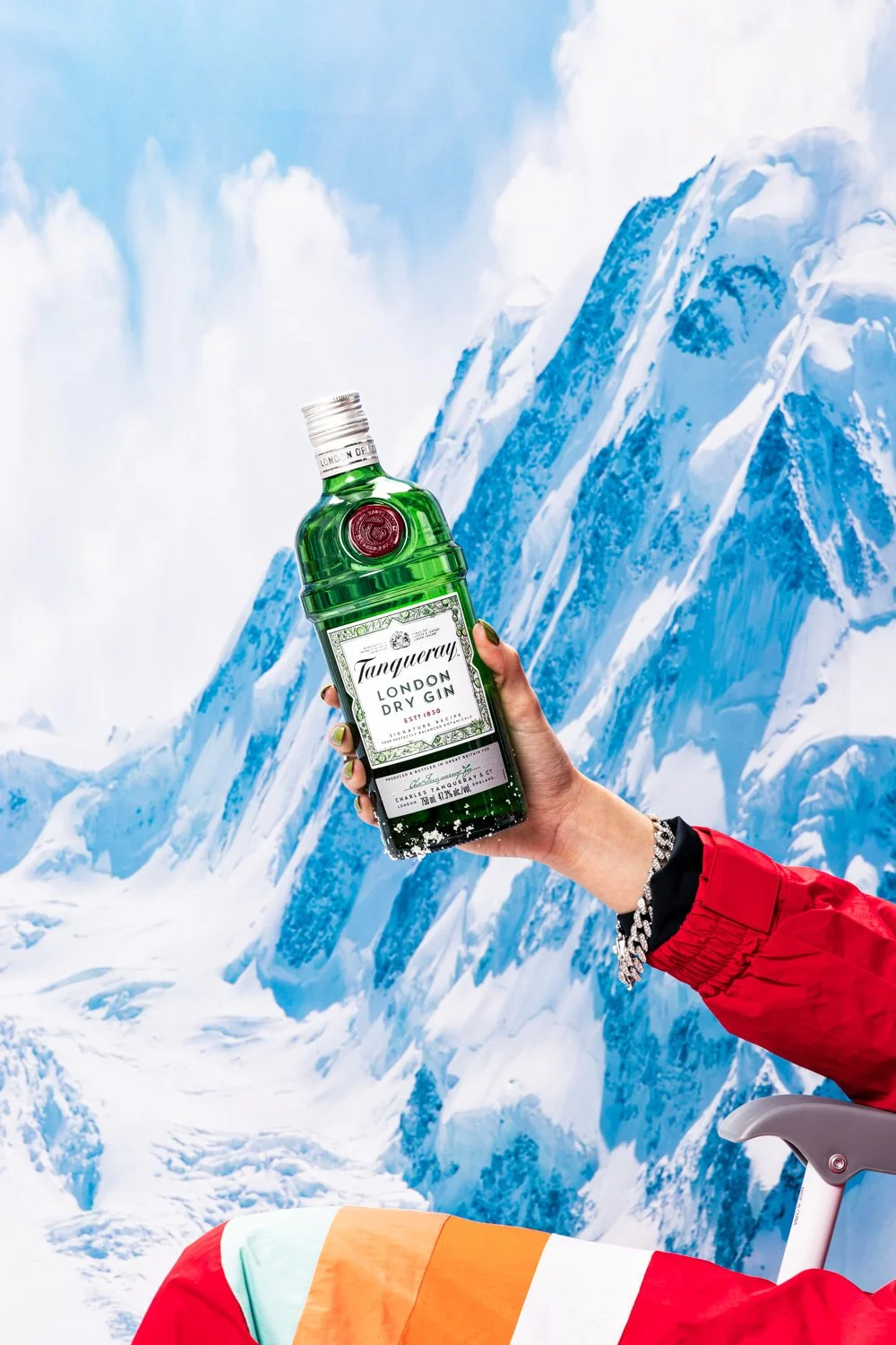 A hand holding a green bottle of Tanqueray London Dry Gin against a backdrop of snowy mountain peaks.