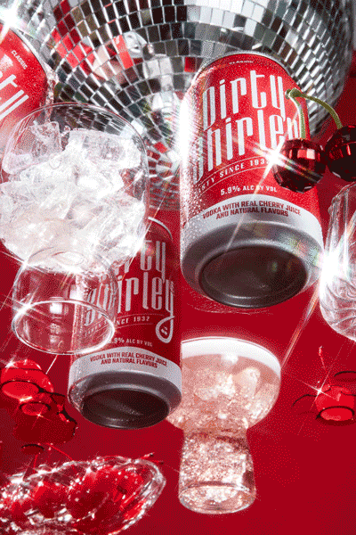 Multiple cans of Dirty Shirley cocktail, ice cubes, and cherries on a red background, with a disco ball and star-shaped decorations.