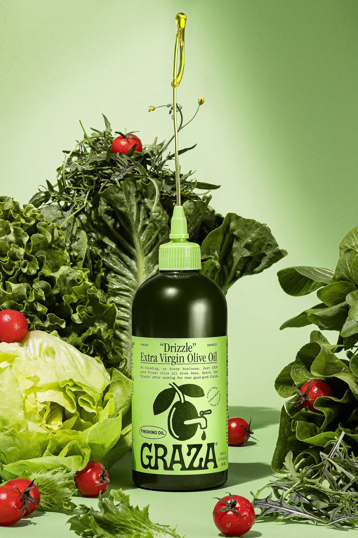 Bottle of Grazia extra virgin olive oil surrounded by lettuce, cherry tomatoes, and leafy greens on a green background.