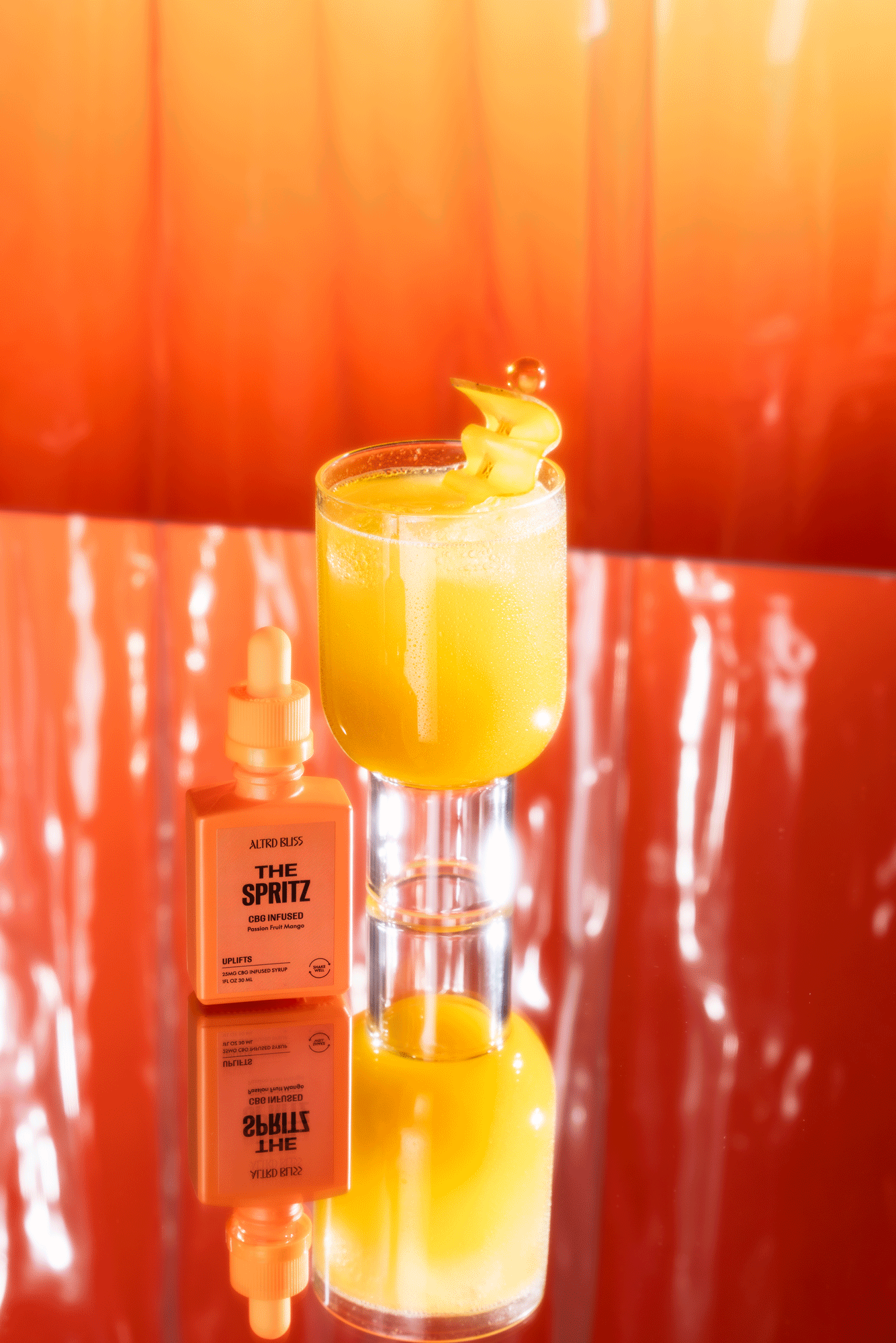 A vibrantly colored cocktail in a short glass with a lemon twist garnish, placed on a reflective orange surface with a small orange bottle labeled "The Spritz, CBG Infused" beside it. The background and surface are shiny orange with vertical reflecti