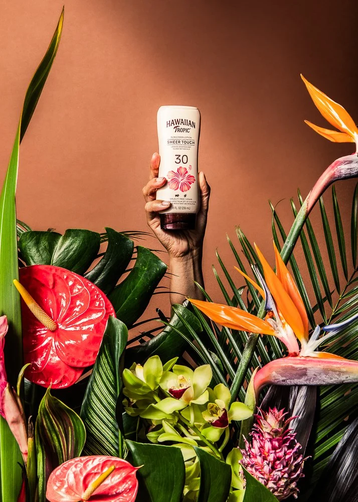 A tube of Hawaiian Tropic sunscreen surrounded by tropical flowers and large green leaves on an orange surface.