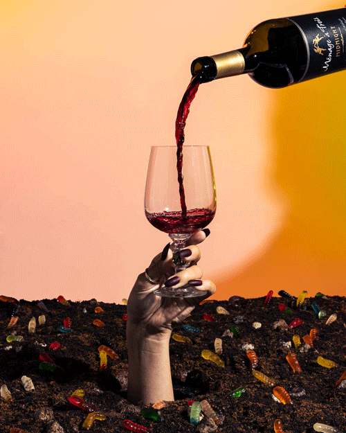 A hand with dark nails holding a wine glass filled with red wine, emerging from a bed of gummy worms and dirt. A bottle of red wine is being poured into the glass against a yellow-orange background.