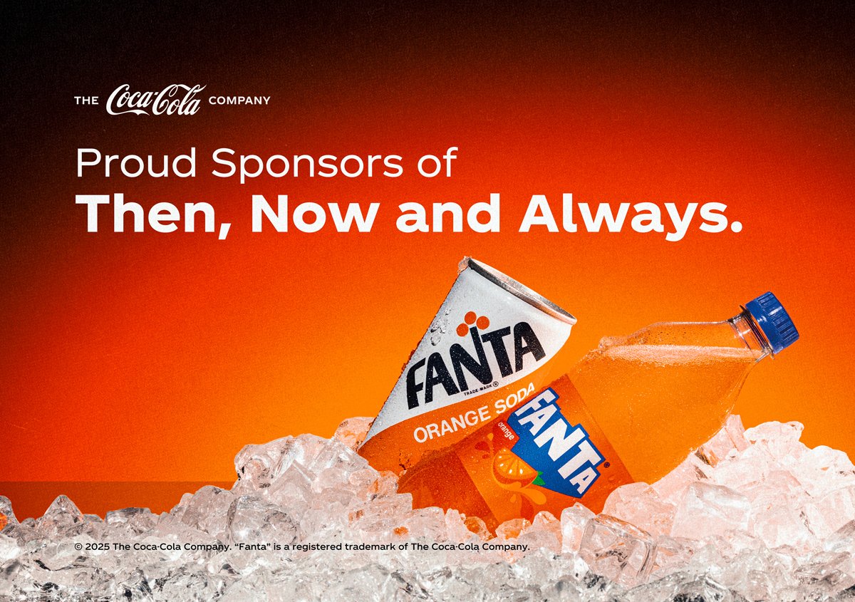 Coca-Cola advertisement featuring a can of Fanta orange soda and a bottle of Fanta with ice and the slogan 'Proud Sponsors of Then, Now and Always' on a red background.