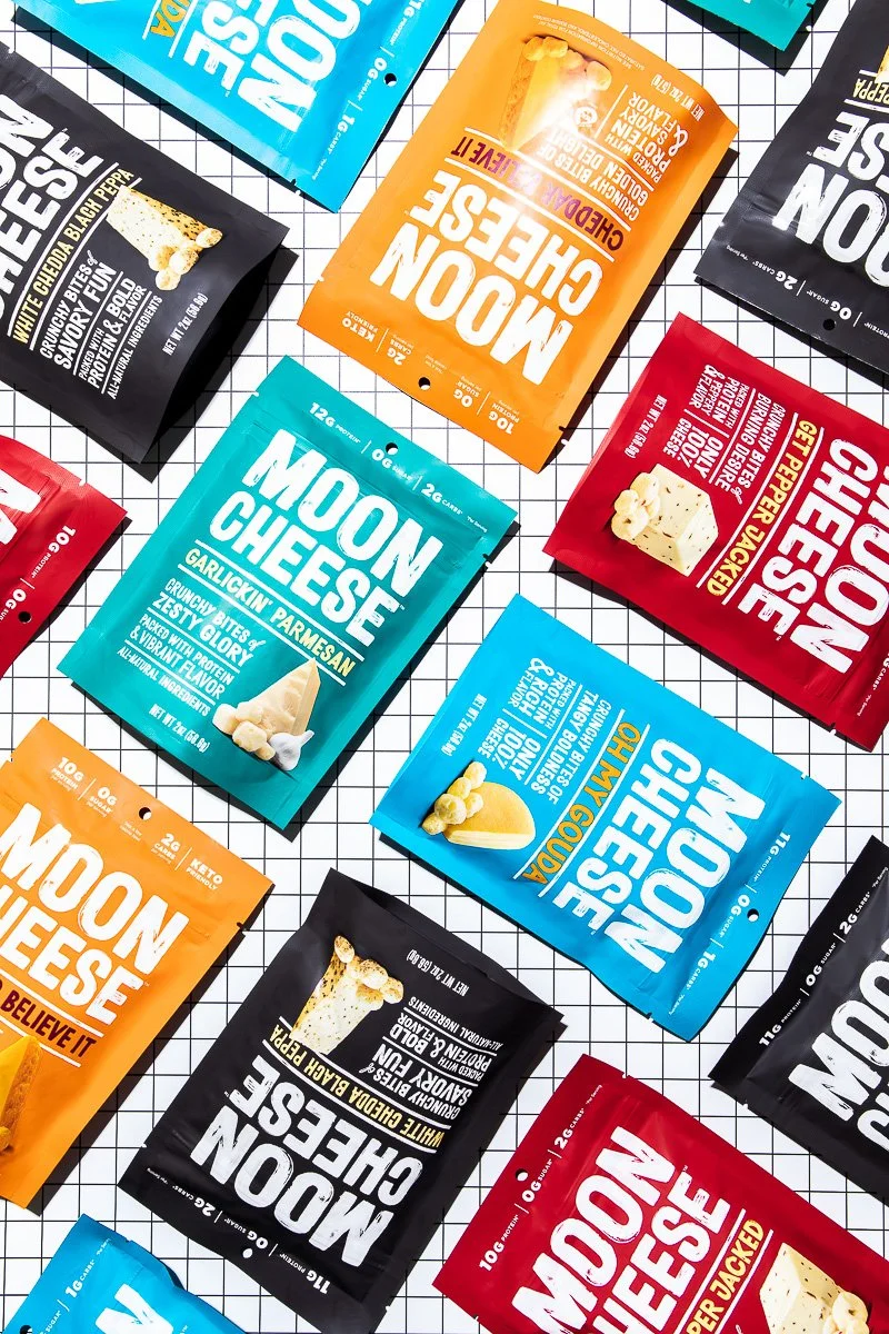 A flat lay display of various MOON CHEESE snack bags in different colors, including orange, black, blue, red, and turquoise, arranged on a white grid-patterned surface. The bags feature snack flavors like Cheddar and Parmesan.