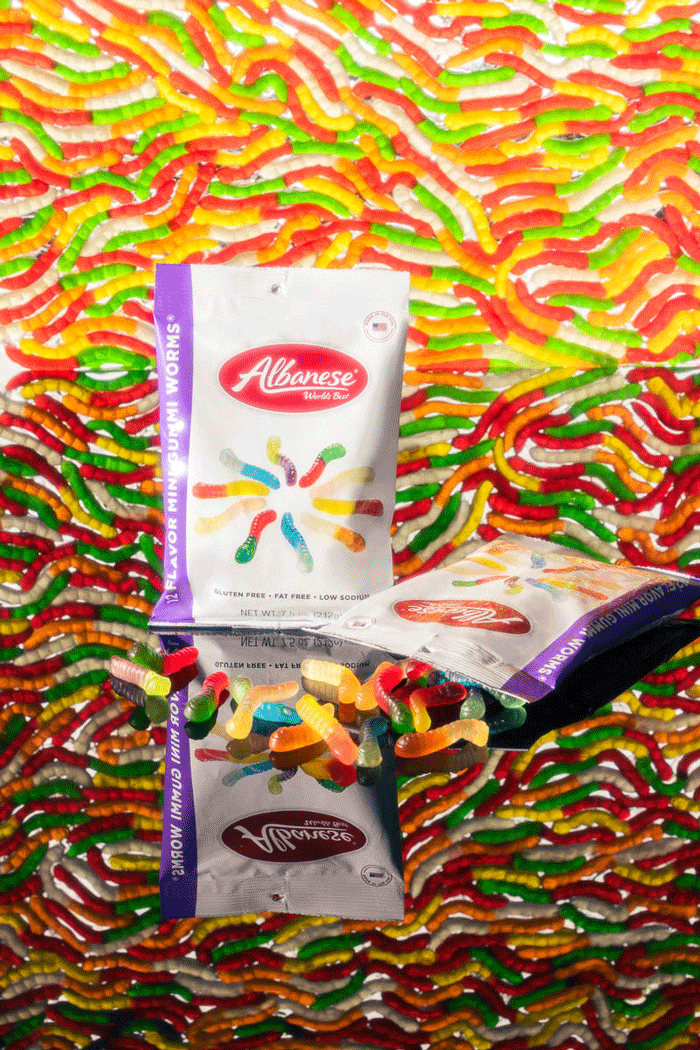 Colorful gummy worms scattered in front of a packet of Albanese gummy worms, with many gummy worms spilling out of the packet and reflecting on a shiny surface. The background is multicolored with more gummy worms.