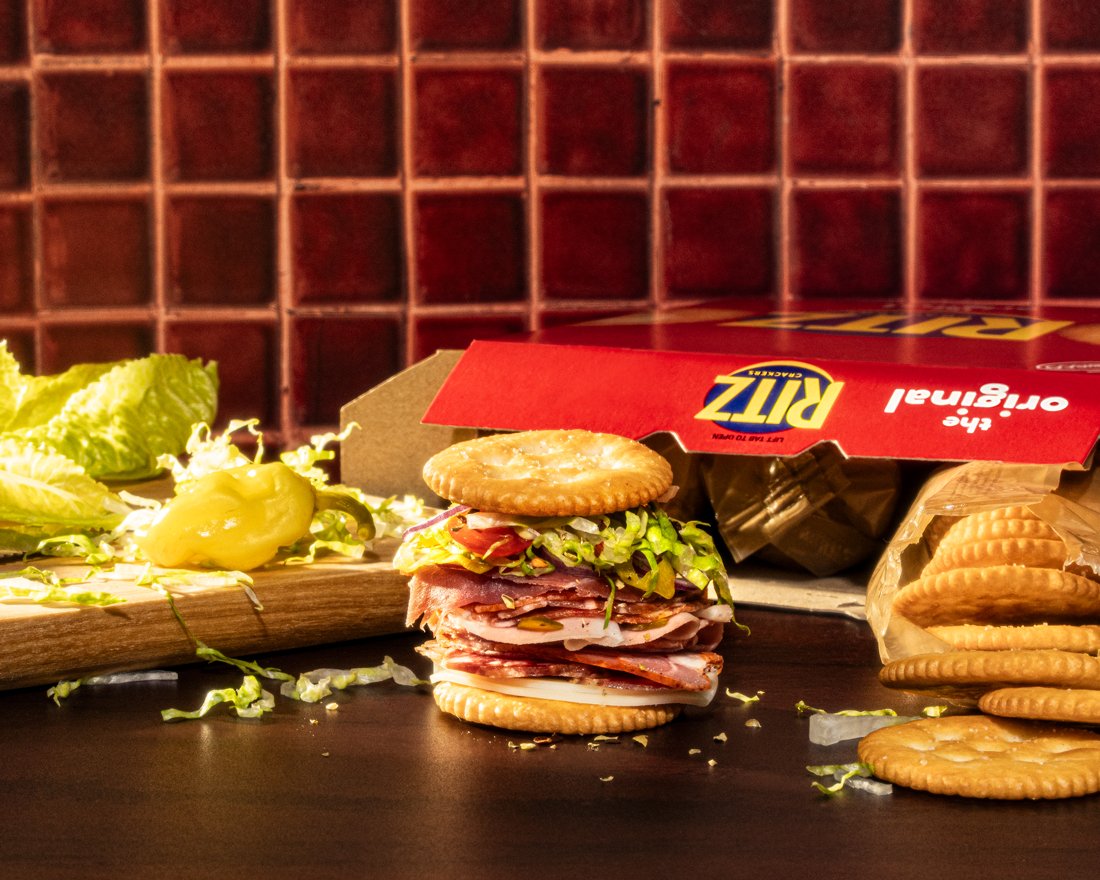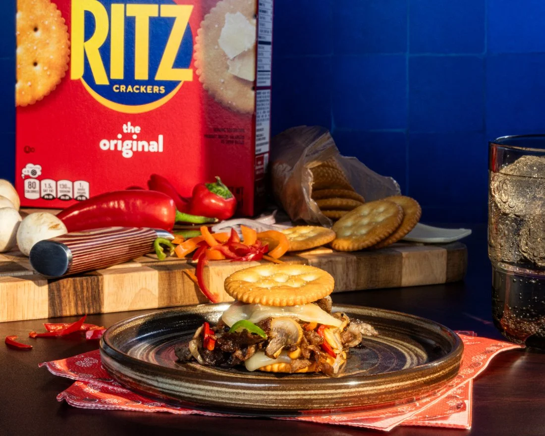 A man with dark skin, short curly hair, and earrings is lying down with his mouth open. He is holding a mini Philly Cheesesteak and is about to eat it. There are two boxes of Ritz crackers in the foreground, and the background is a solid red color.