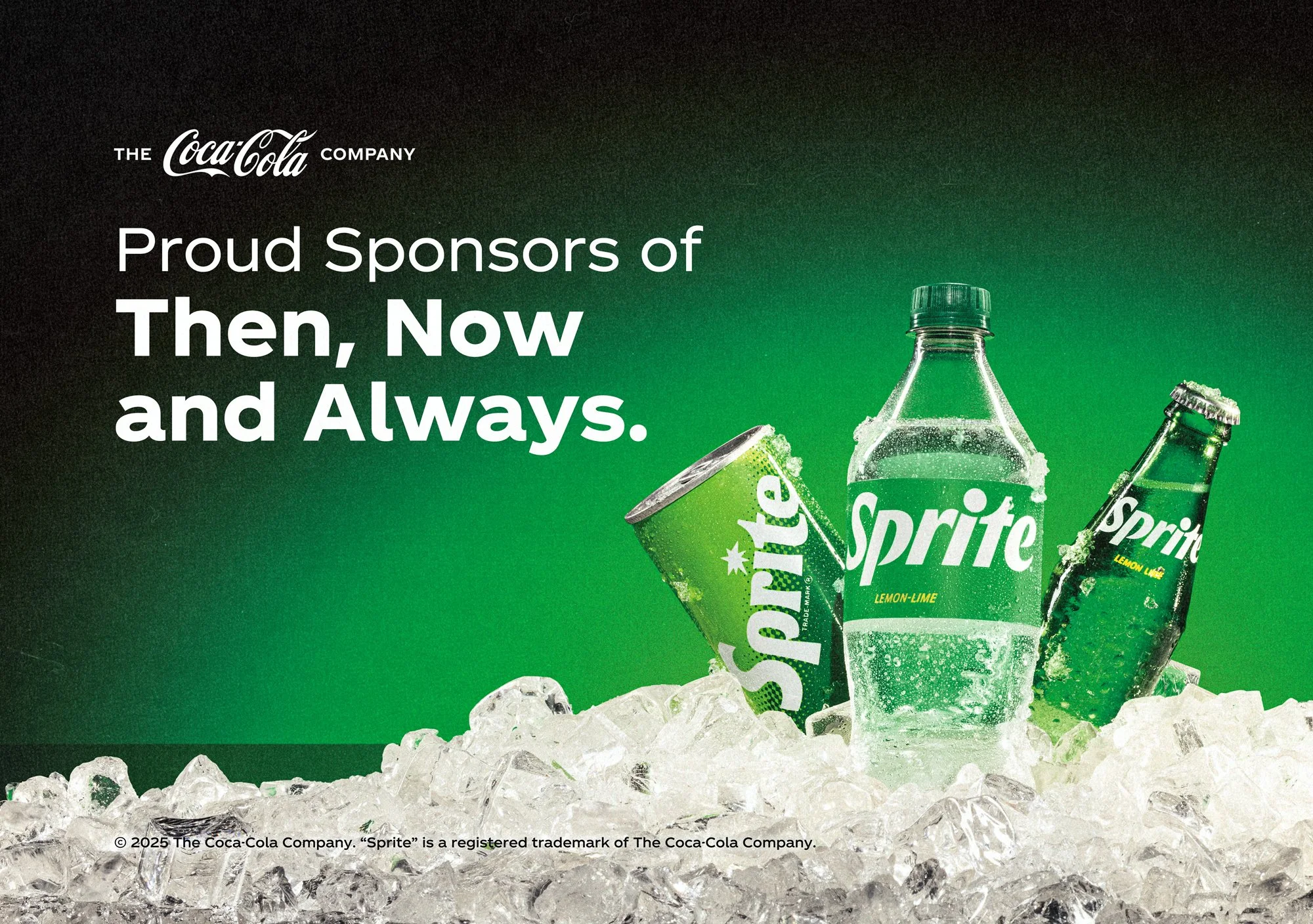 Coca-Cola marketing image showing Sprite bottles and cans on ice with the text 'Proud Sponsors of Then, Now and Always' against a green background.
