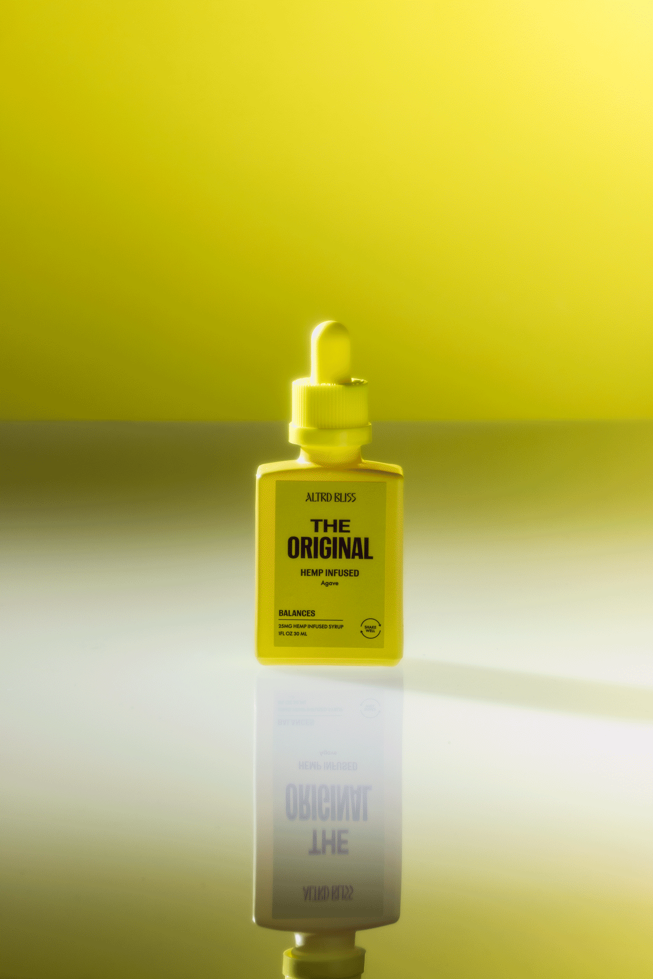 A small yellow dropper bottle labeled 'The Original Hemp Infused' by Altrd Bliss, with a yellow and green background and its reflection visible on the white surface beneath it.