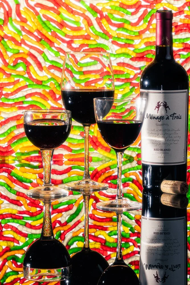 Three glasses of red wine and one wine bottle on a reflective surface with colorful gummy worms background