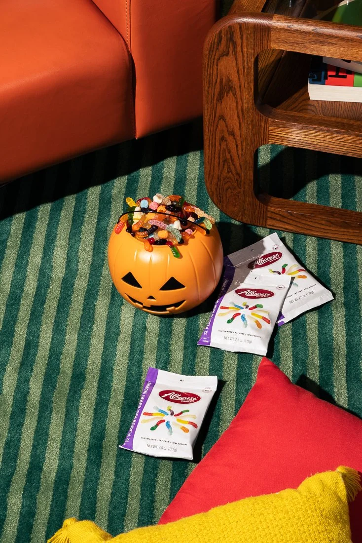 A pumpkin-shaped candy container filled with gummy worms and gummy candies. Four packets of candy lay on the green and beige striped carpet near a red and yellow pillow, with part of a wooden table and an orange sofa in the background.