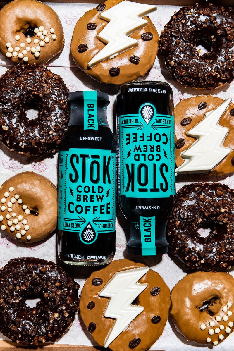 Assorted donuts with chocolate, white icing, and sprinkles, two cans of Stok Cold Brew Coffee with black and blue labeling, arranged on a tray.