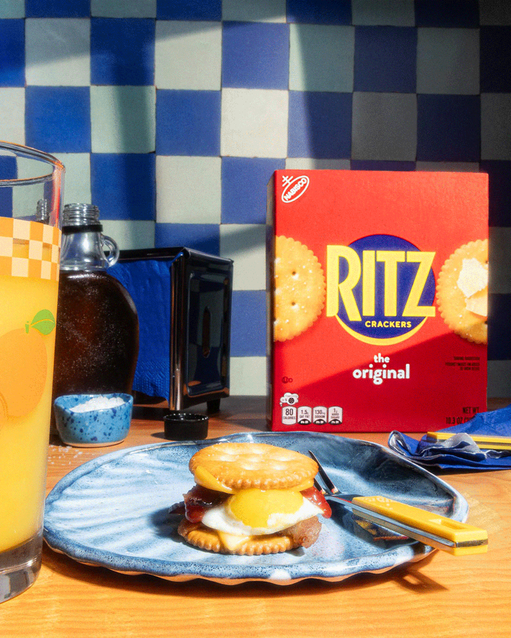 A breakfast scene featuring a sandwich with a cracker, fried egg, and bacon on a blue plate, a glass of orange juice, a box of Ritz crackers, and various condiments on a wooden table with a blue checkered wallpaper background.