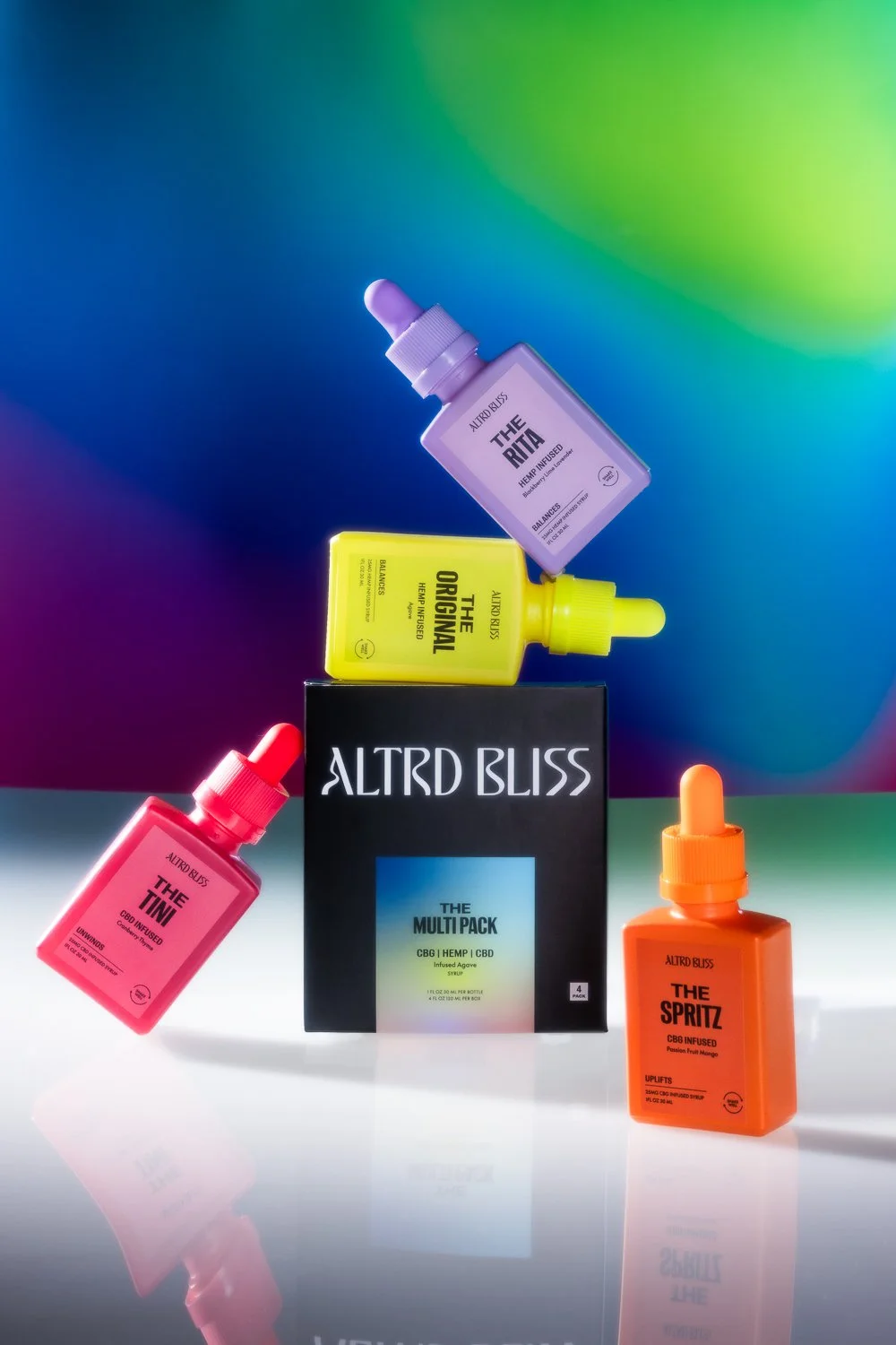 Colorful display of CBD products with bottles labeled THE TINI, THE RITA, THE ORIGINAI, and THE SPRITZ, arranged on and around a black box labeled ALTRD BLISS against a vibrant, gradient background.