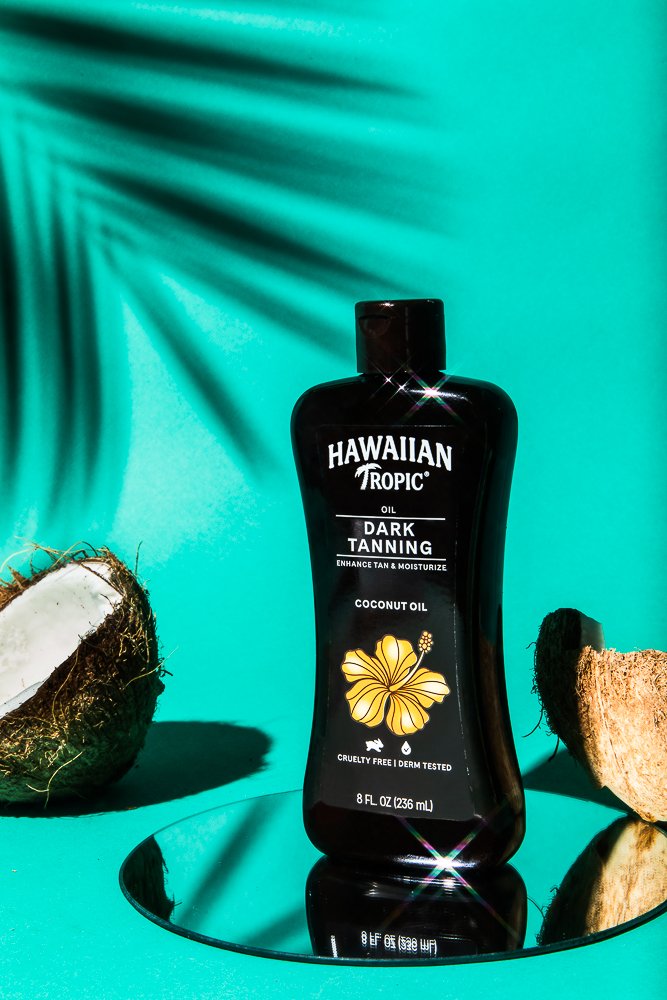 Hawaiian Tropic dark tanning oil bottle with coconut on a reflective surface, turquoise background, and tropical shadows.