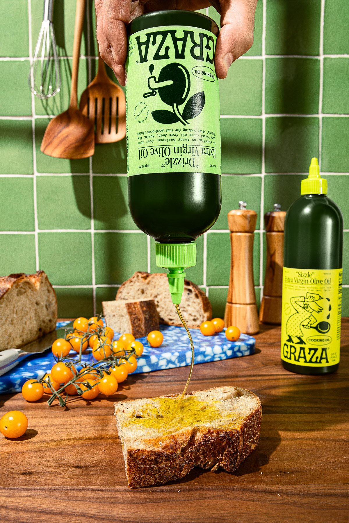 A bottle of green olive oil being poured onto a slice of toasted bread with olive oil drip, on a wooden table with cherry tomatoes, bread loaves, and kitchen utensils in the background.