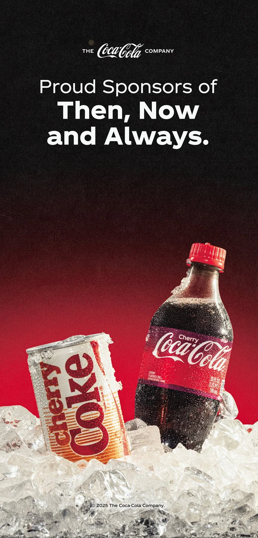 Coca-Cola and cherry-flavored Coke bottles on ice with a black background and white text that reads 'Proud Sponsors of Then, Now and Always', with Coca-Cola logo at the top.