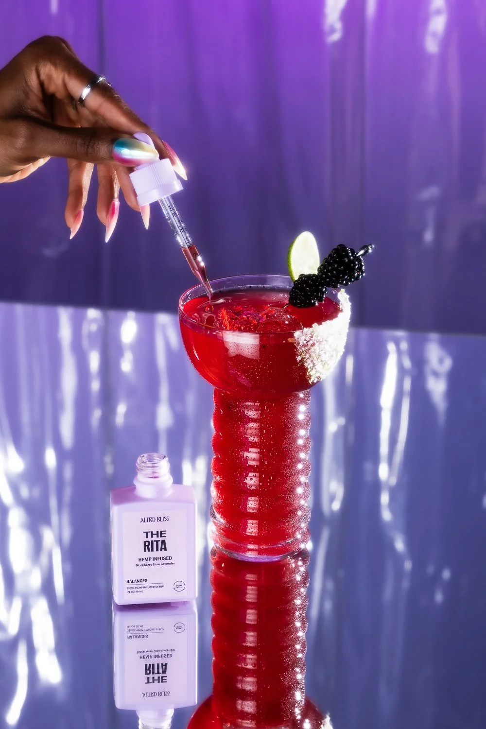 A white bottle labeled 'The Rita' with hemp infusion, blackberry, lime, and lavender ingredients, standing on a reflective surface with purple and blue lighting, accompanied by a blackberry and lime wedge.